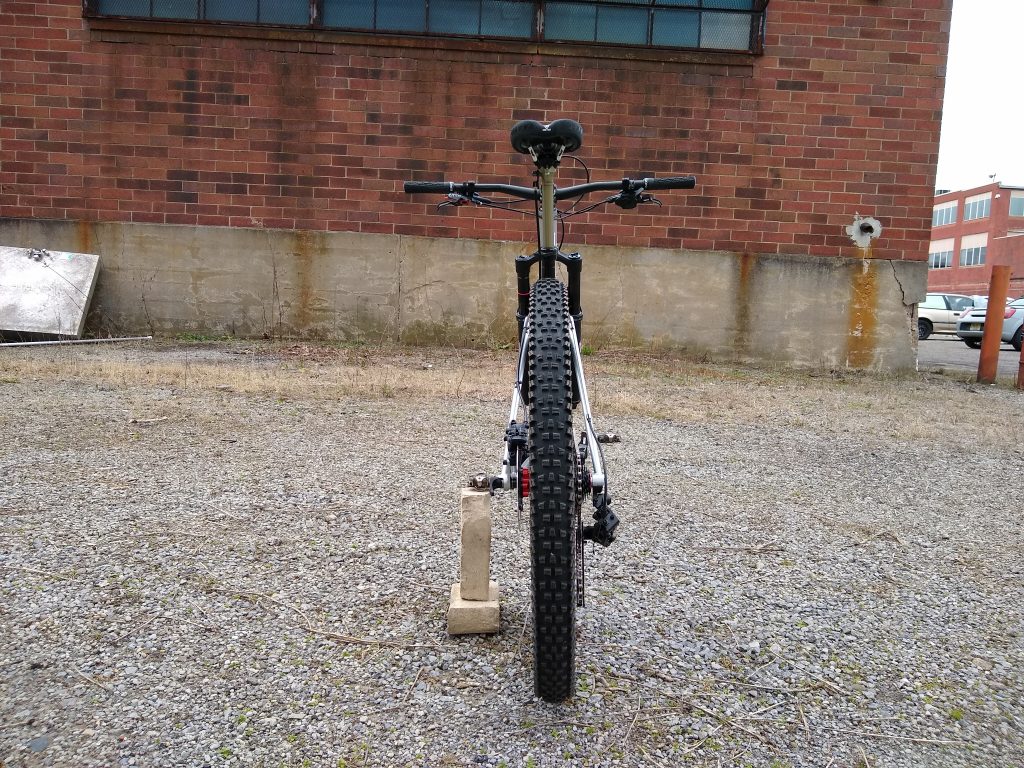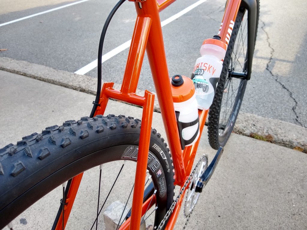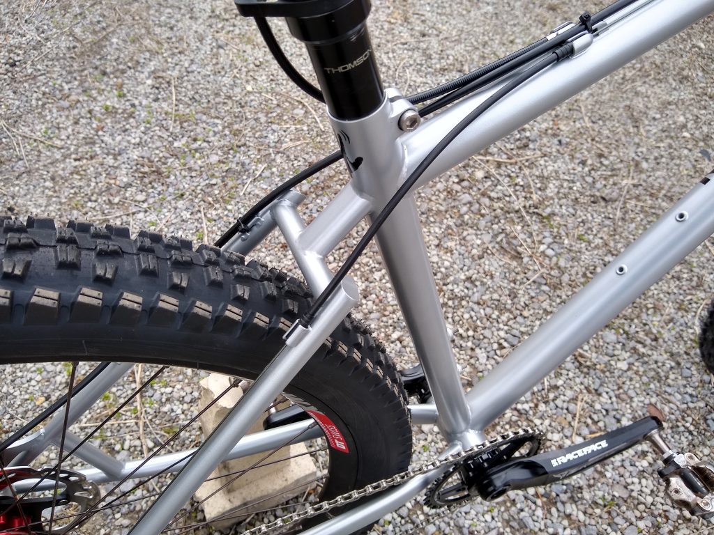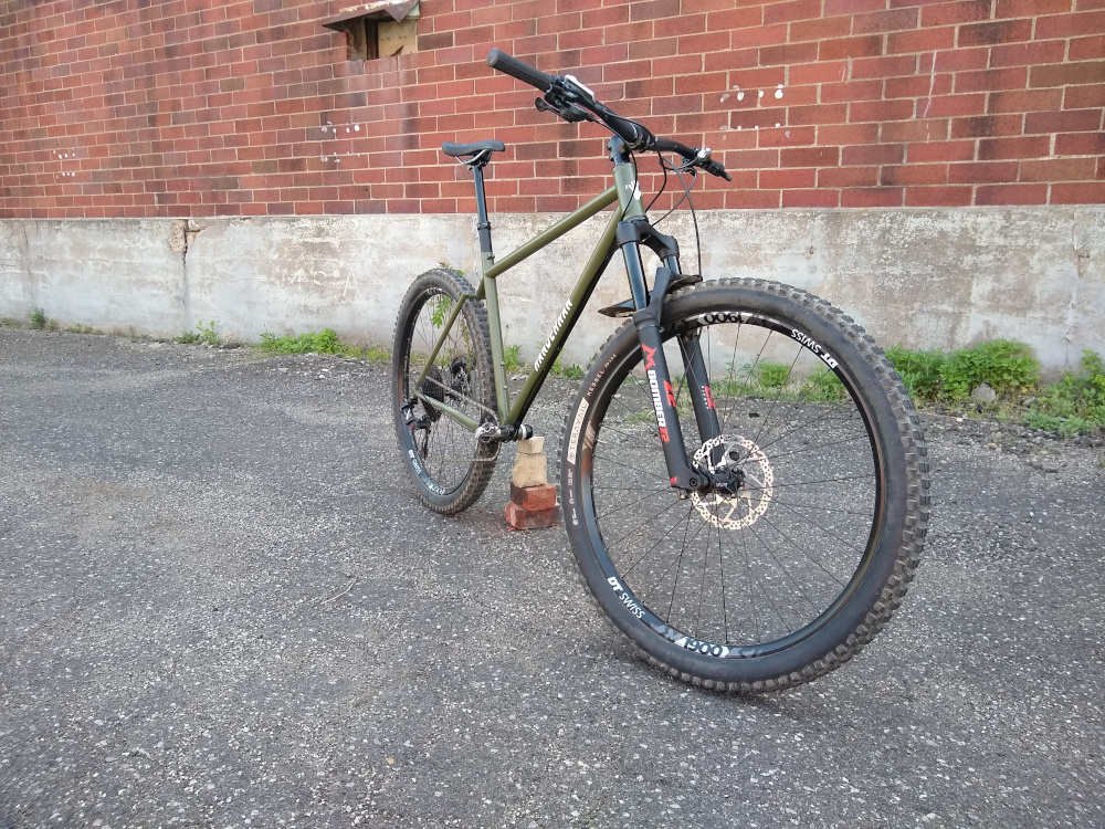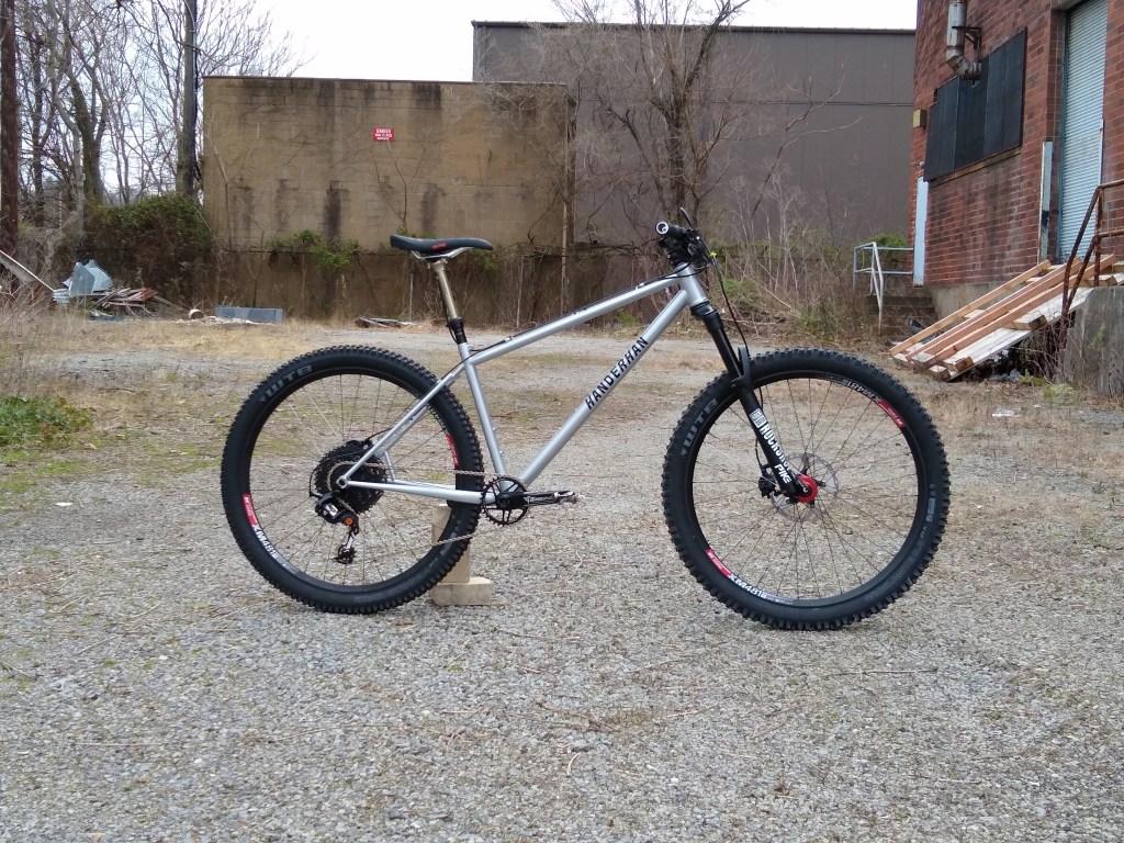 Trail hardtail tailored for western PA woods. Low bottom bracket, longish top tube, slackish head tube, clearance for 27.5 x 2.5″ tires. Box One 11-speed drivetrain, Race Face Turbine cranks, handbuilt Hope / DT Swiss wheels.