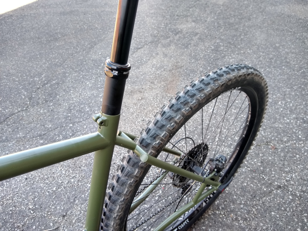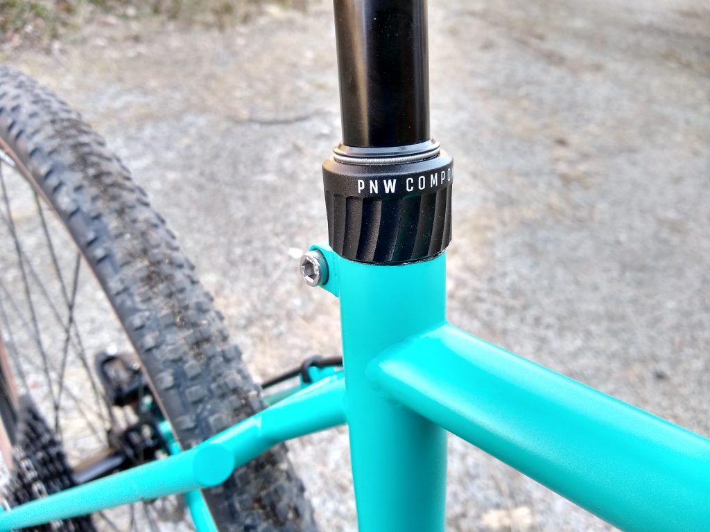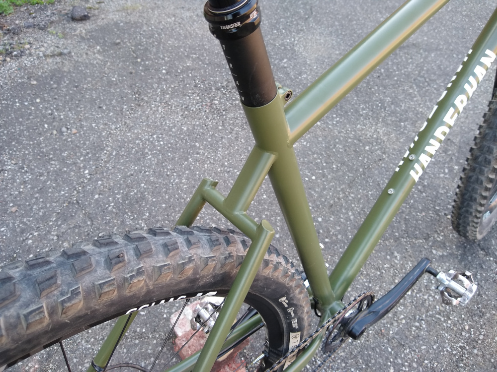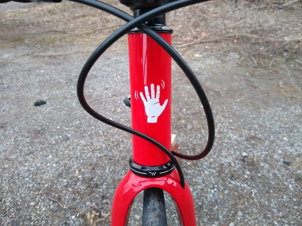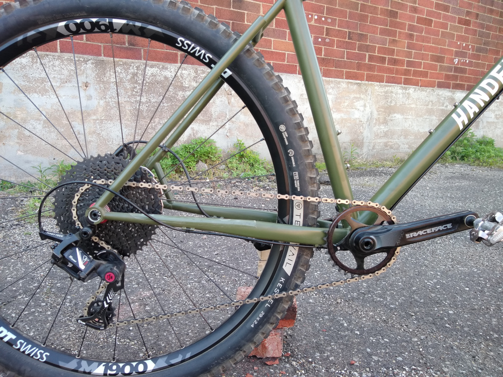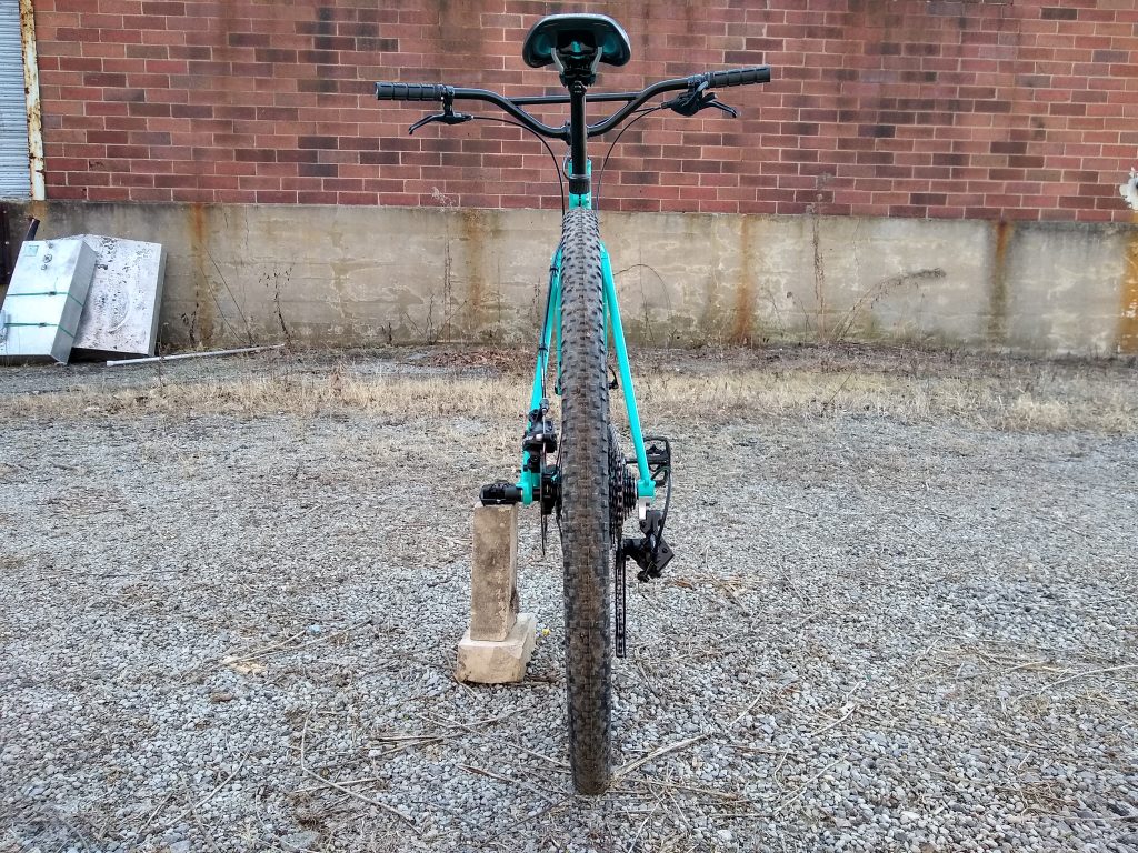 Trail hardtail tailored for western PA woods. Low bottom bracket, longish top tube, slackish head tube, clearance for 27.5 x 2.5″ tires. Box One 11-speed drivetrain, Race Face Turbine cranks, handbuilt Hope / DT Swiss wheels.