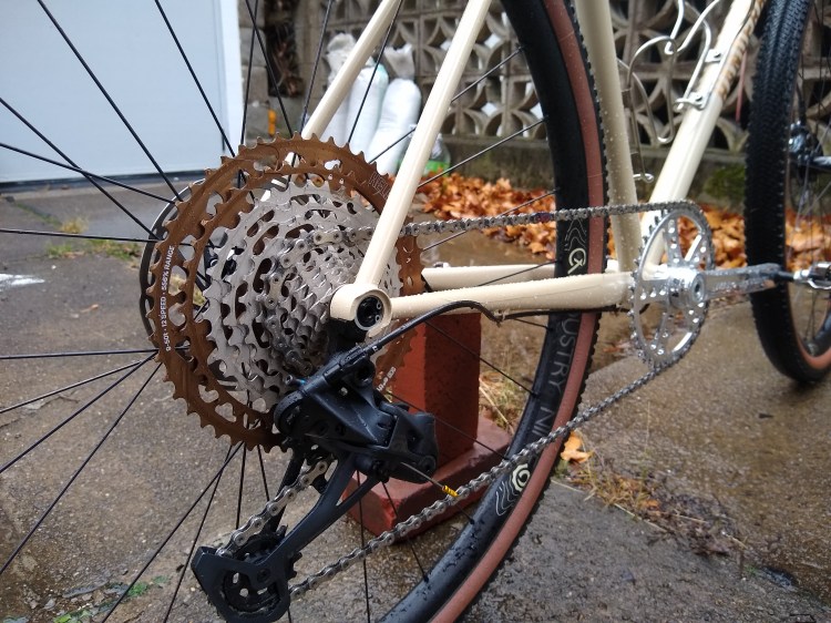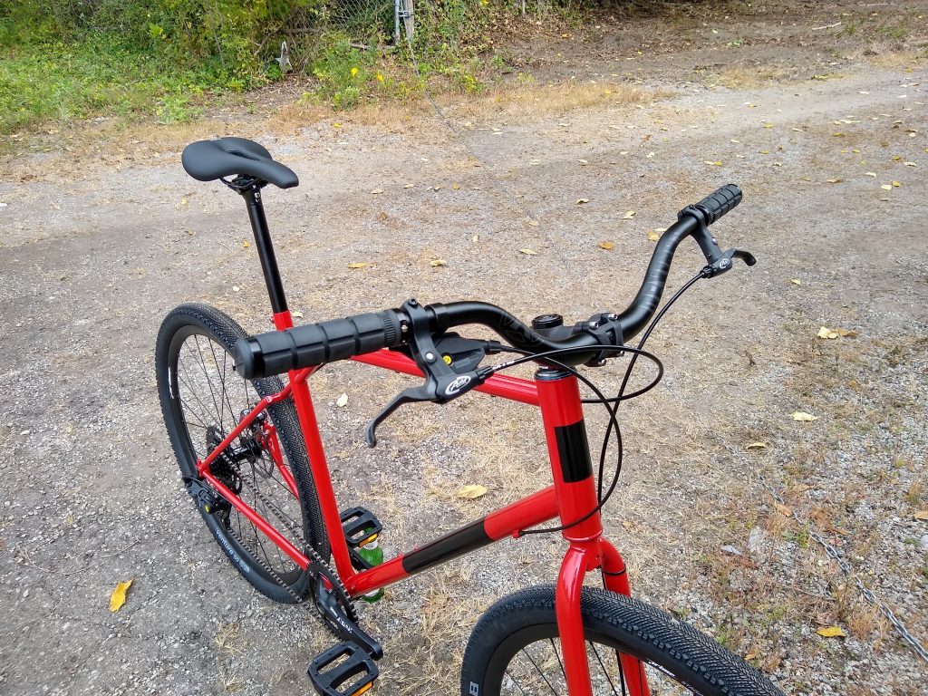 Gravel bike (read: hybrid) with low center of gravity, upright riding position, and clearance for ~45mm tires. Equipped with a wide range 1×11 drivetrain and flat mount disc brakes.