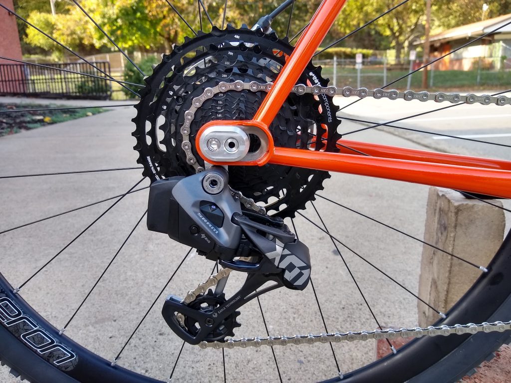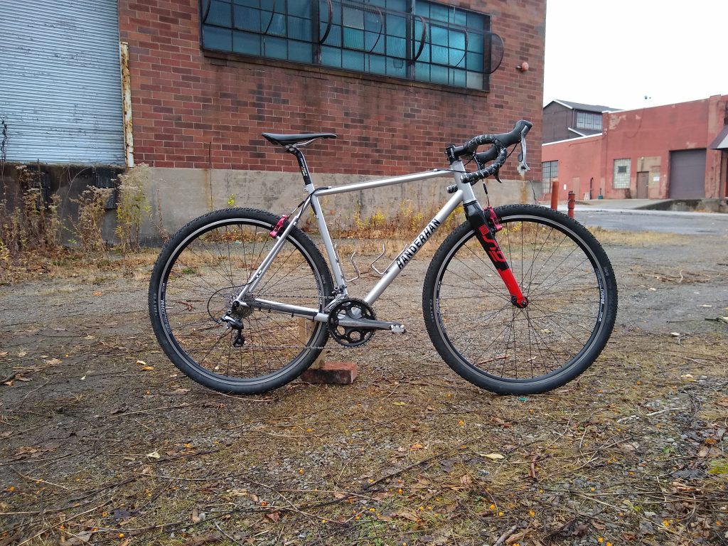 Cyclocross bike with my custom sliding 12mm dropouts. Can be run singlespeed or geared. Curretly set up with a Sram AXS electronic derailleur (no cables anywhere!). White Industries crank and chainring. Hand built wheels. TRP hydraulic brakes.