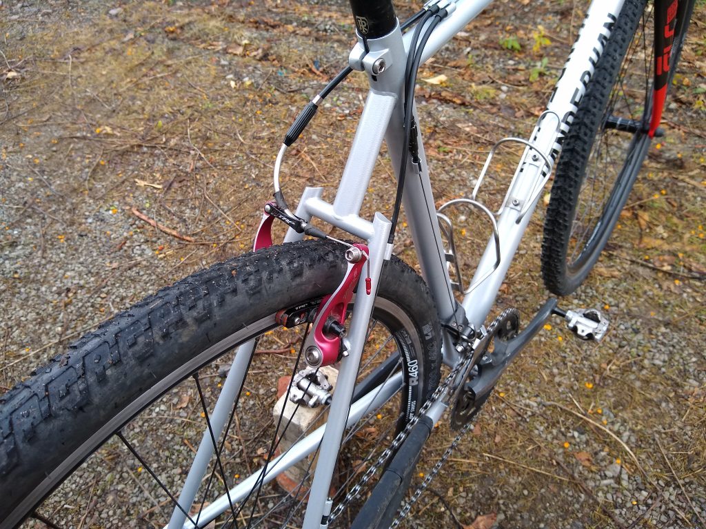 My personal “neo-retro” cyclocross bike. Old-school 2×10 speed drivetrain and rim brakes on a modern low and long geometry frame that’s optimized for stable handling. This bike spends equal parts of its life on singletrack, on the road, and on the cross course.
