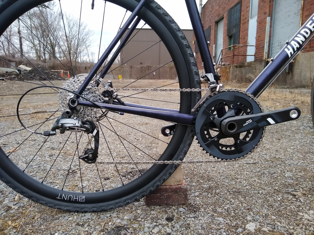 Gravel bike with flat mount disc brakes, fender mounts, and clearance for 40mm tires. Outfitted with a Sram Force 22 drivetrain, Hunt carbon wheels, and a Whisky carbon fork and cockpit.