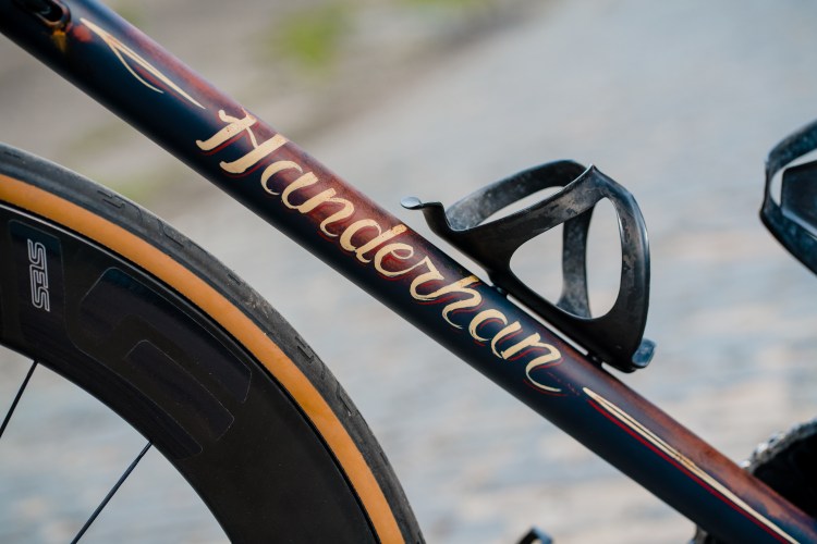Cyclocross bike with tapered head tube, flat mount brakes, and integrated seat post clamp. Painted to match the 1966 Dodge color “Turf Green”. Equipped with a Sram Force 1×11 drivetrain, carbon cockpit, and handbuild carbon wheels.