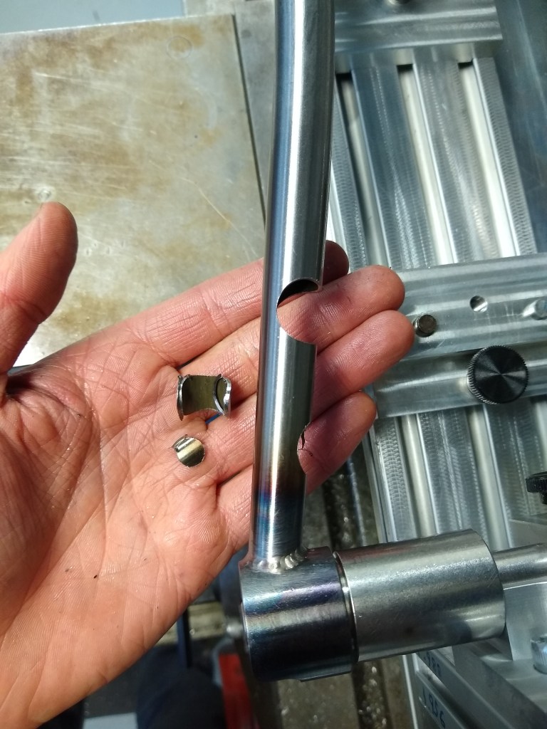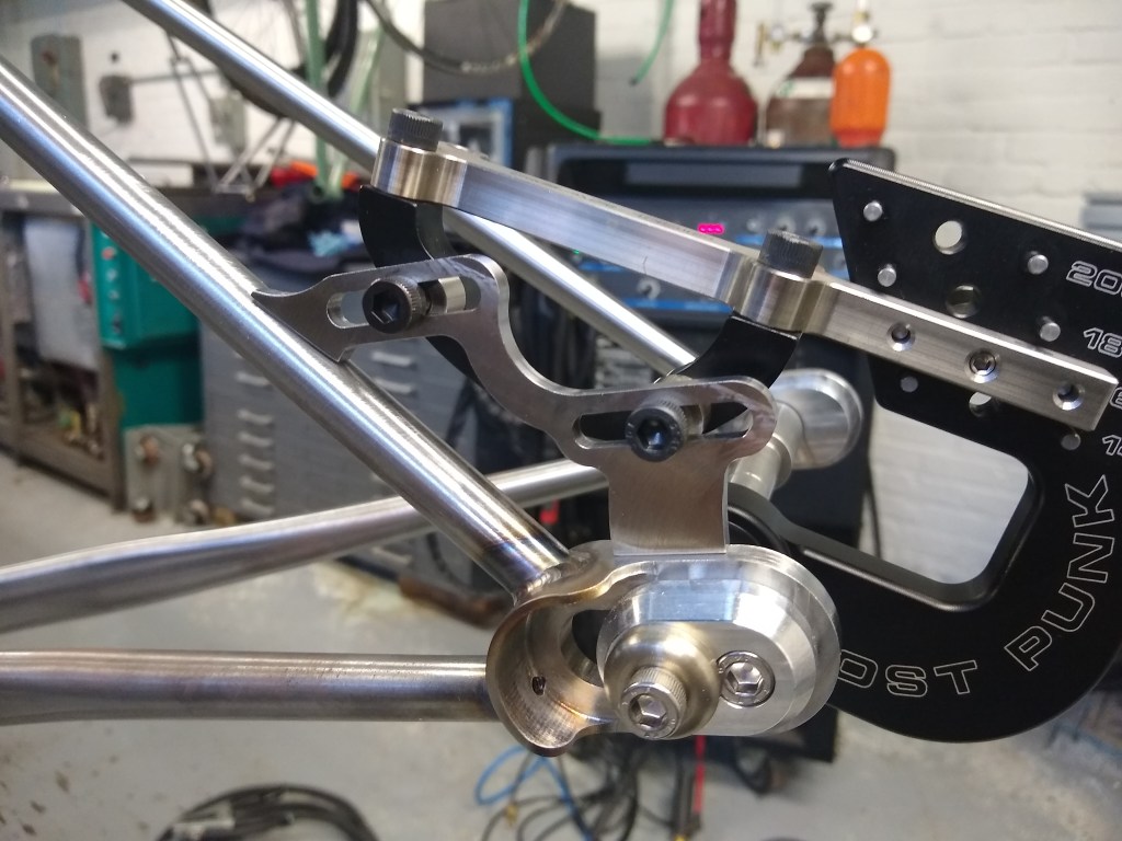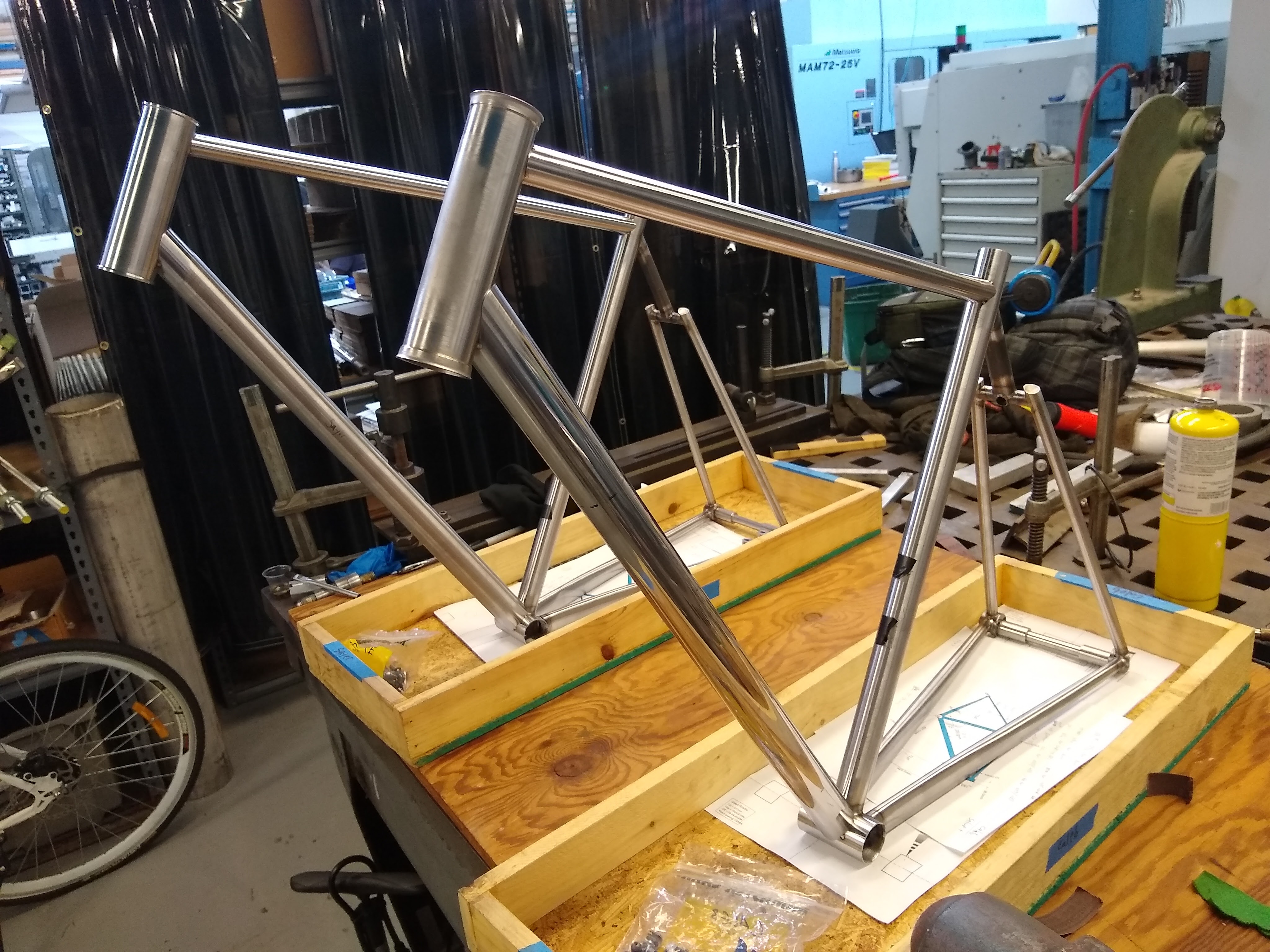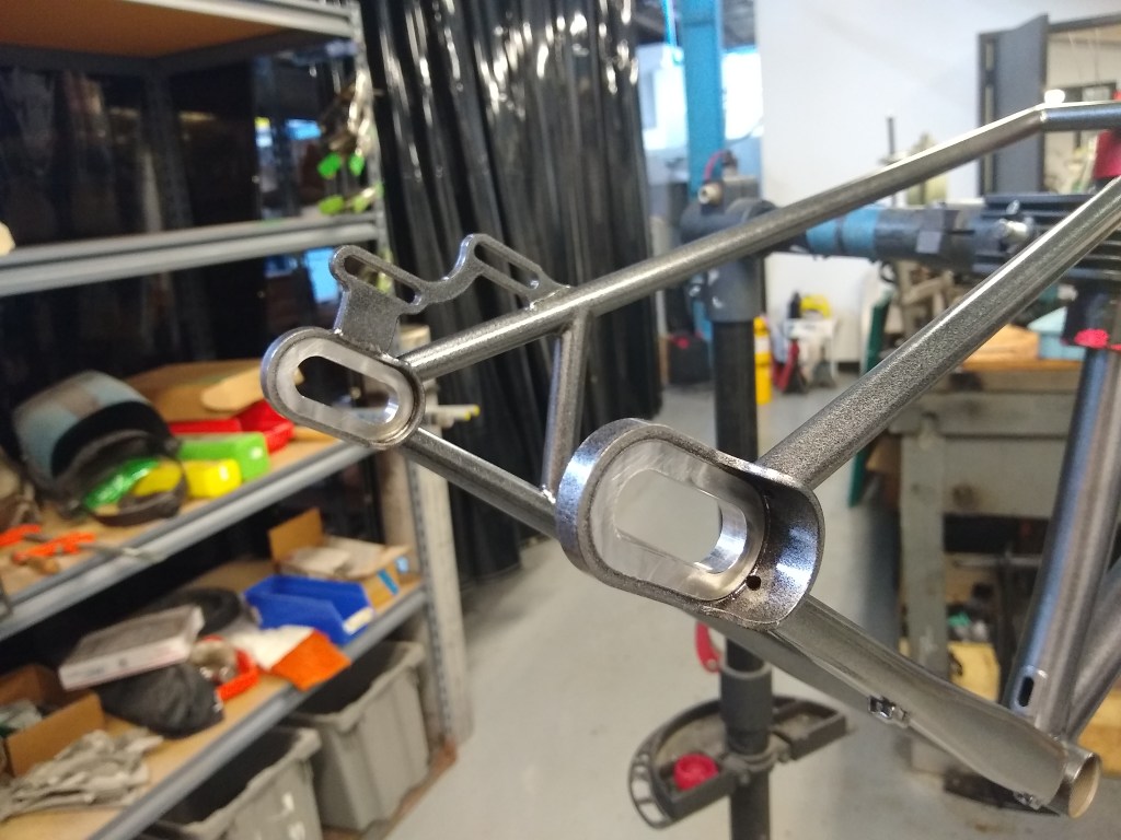 Cutting the chainstay/dropout miter with the Cobra Miter BuddyChainstay tacked to dropoutFinish weldChainstay mitering setup in the vertical millTwo nice chainstay/BB mitersCutting holes for flat mount brake bossesFlat mount brake boss fixture I machinedFlat mount brake bosses welded into chainstays