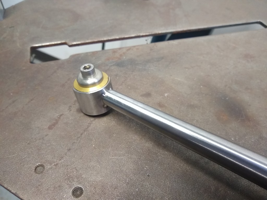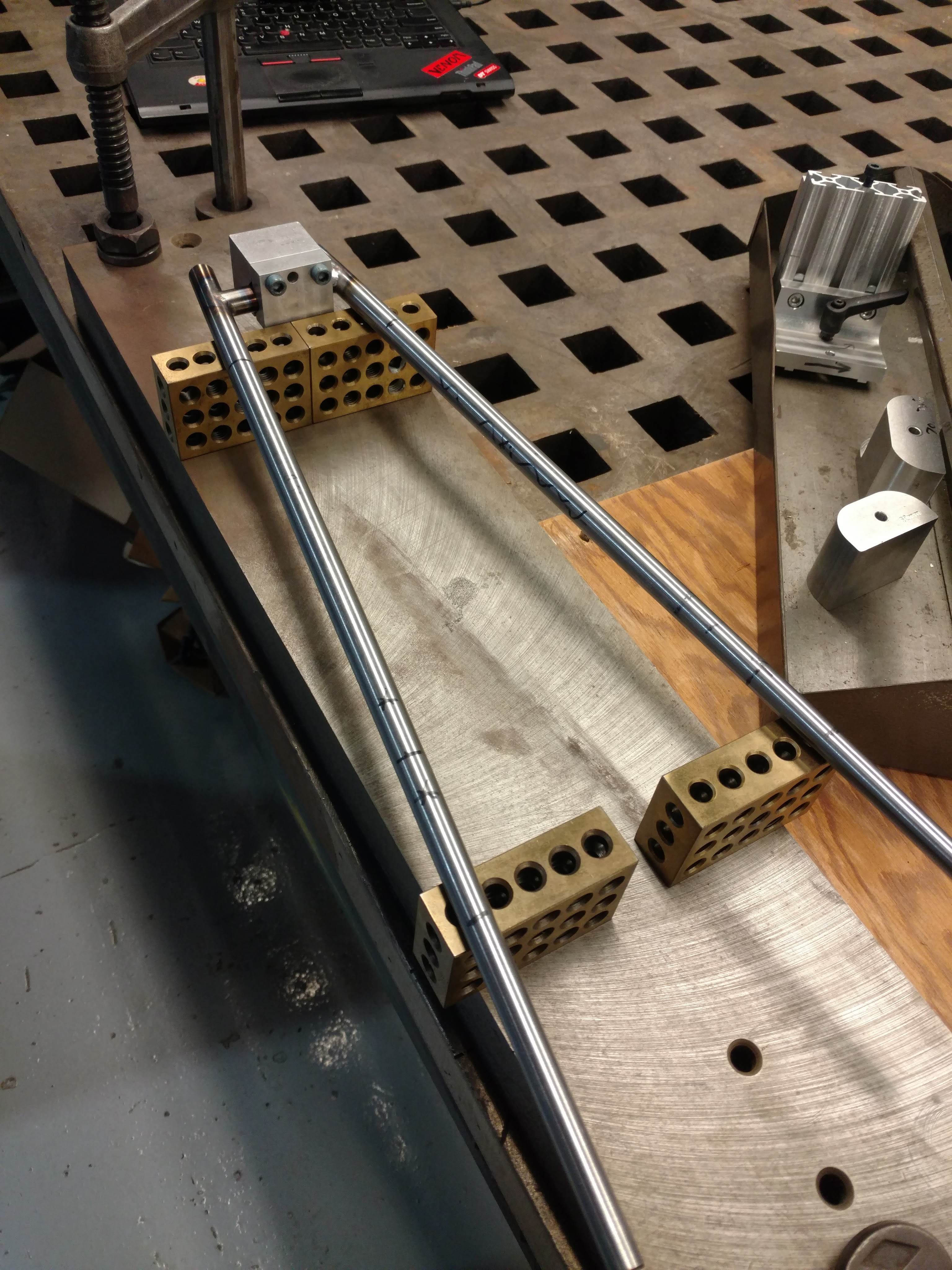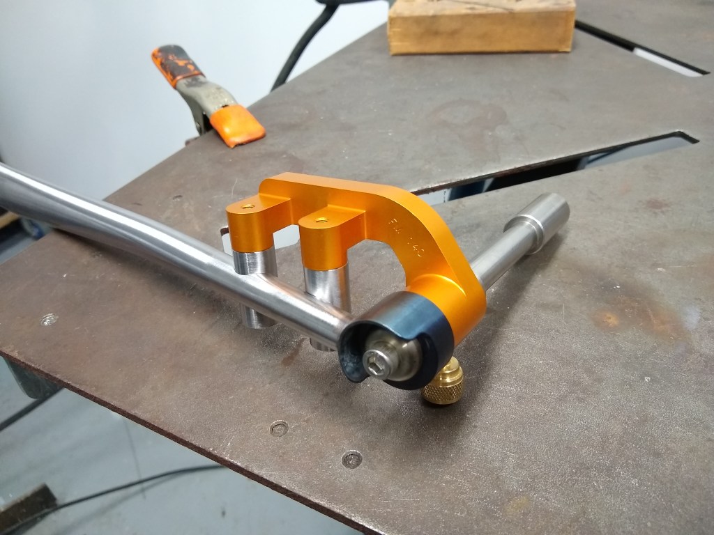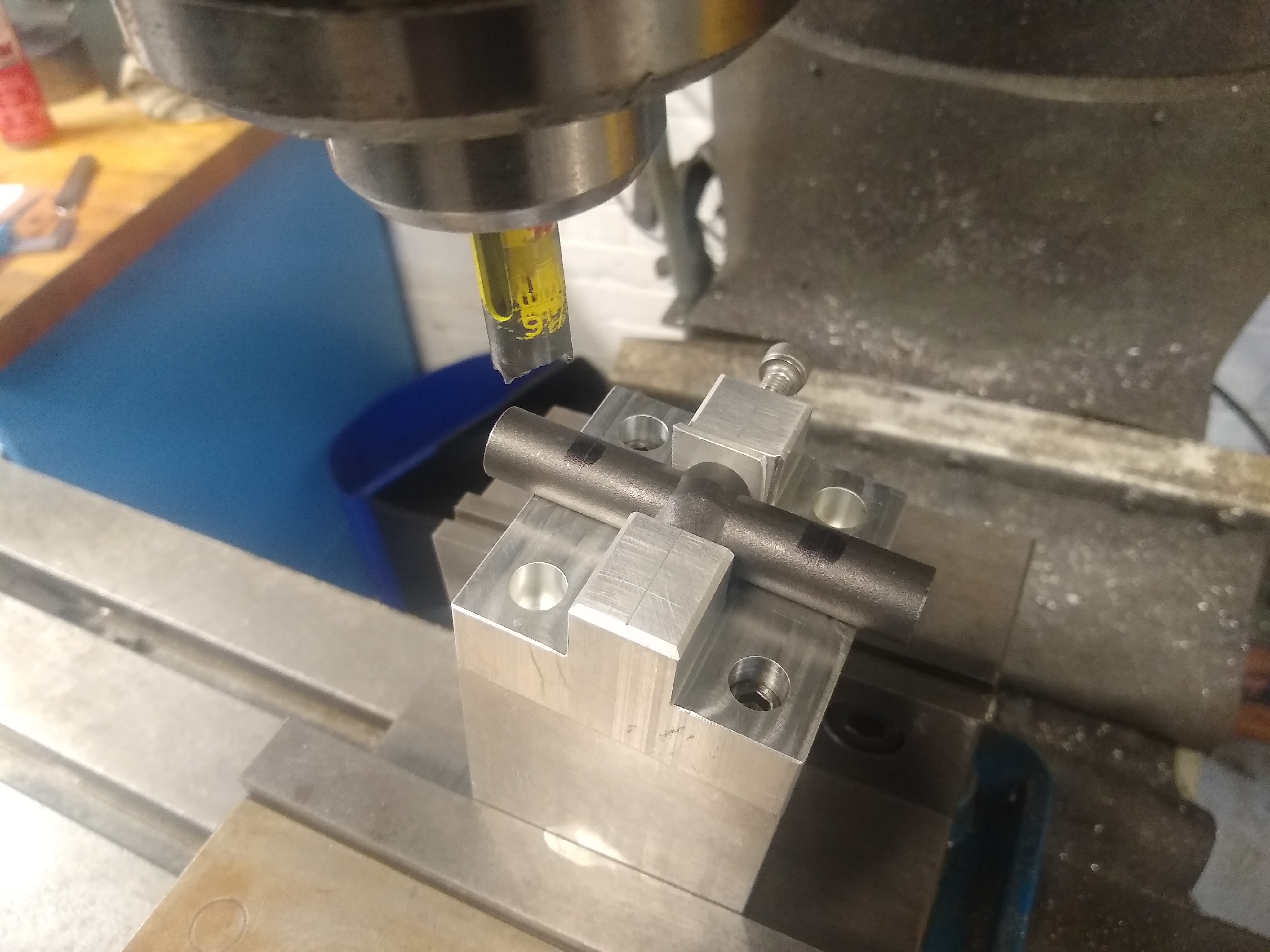 Cutting the chainstay/dropout miter with the Cobra Miter BuddyChainstay tacked to dropoutFinish weldChainstay mitering setup in the vertical millTwo nice chainstay/BB mitersCutting holes for flat mount brake bossesFlat mount brake boss fixture I machinedFlat mount brake bosses welded into chainstays